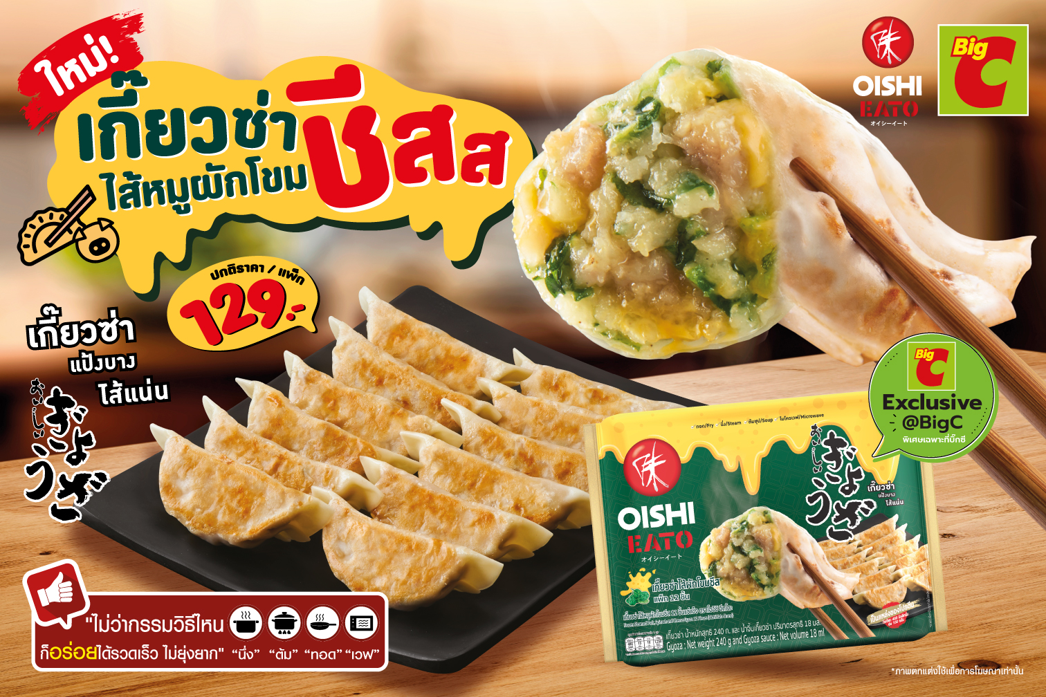 โออิชิ อีทโตะ (OISHI EATO) สร้างปรากฎการณ์ความอร่อย ล่าสุด เปิดตัวเมนูเกี๊ยวซ่าฟิวชันที่ทั้งแปลกใหม่และลงตัว ขอแนะนำให้ลอง โออิชิ อีทโตะ เกี๊ยวซ่า ไส้หมูผักโขมชีส พร้อมเอาใจนักกินและคนรักเกี๊ยวซ่า ด้วยเกี๊ยวซ่าญี่ปุ่น สูตรพิเศษ แป้งบาง นุ่ม ผสานรสชาติที่กลมกล่อม ลงตัว ด้วยไส้หมูผักโขมชีส ที่คัดสรรเนื้อหมูคุณภาพดี มาเข้าคู่กับผักโขมอบชีส อร่อยแบบยืด ๆ ชีสมอสซาเรลลา...เข้มข้น หอม อร่อย ไม่เหมือนใคร และสามารถนำไปสร้างสรรค์ได้ตามใจหลากหลายสไตล์ ไม่ว่าจะทอด นึ่ง ต้ม หรืออุ่นไมโครเวฟ ก็สะดวก อร่อย ให้ทุกช่วงเวลายิ่งมีสีสัน และสุขล้ำกว่าเคย โดยวางจำหน่ายในรูปแบบแช่แข็ง ขนาดจุใจ 12 ชิ้น ราคาแพ็กละ 129 บาท ที่ บิ๊กซี ทุกสาขาใกล้ ๆ คุณ ติดตามข้อมูลข่าวสาร หรือโปรโมชันที่น่าสนใจอื่น ๆ เพิ่มเติม คลิกแฟนเพจโออิชิอีทโตะ: www.facebook.com/OishiEatoThailand