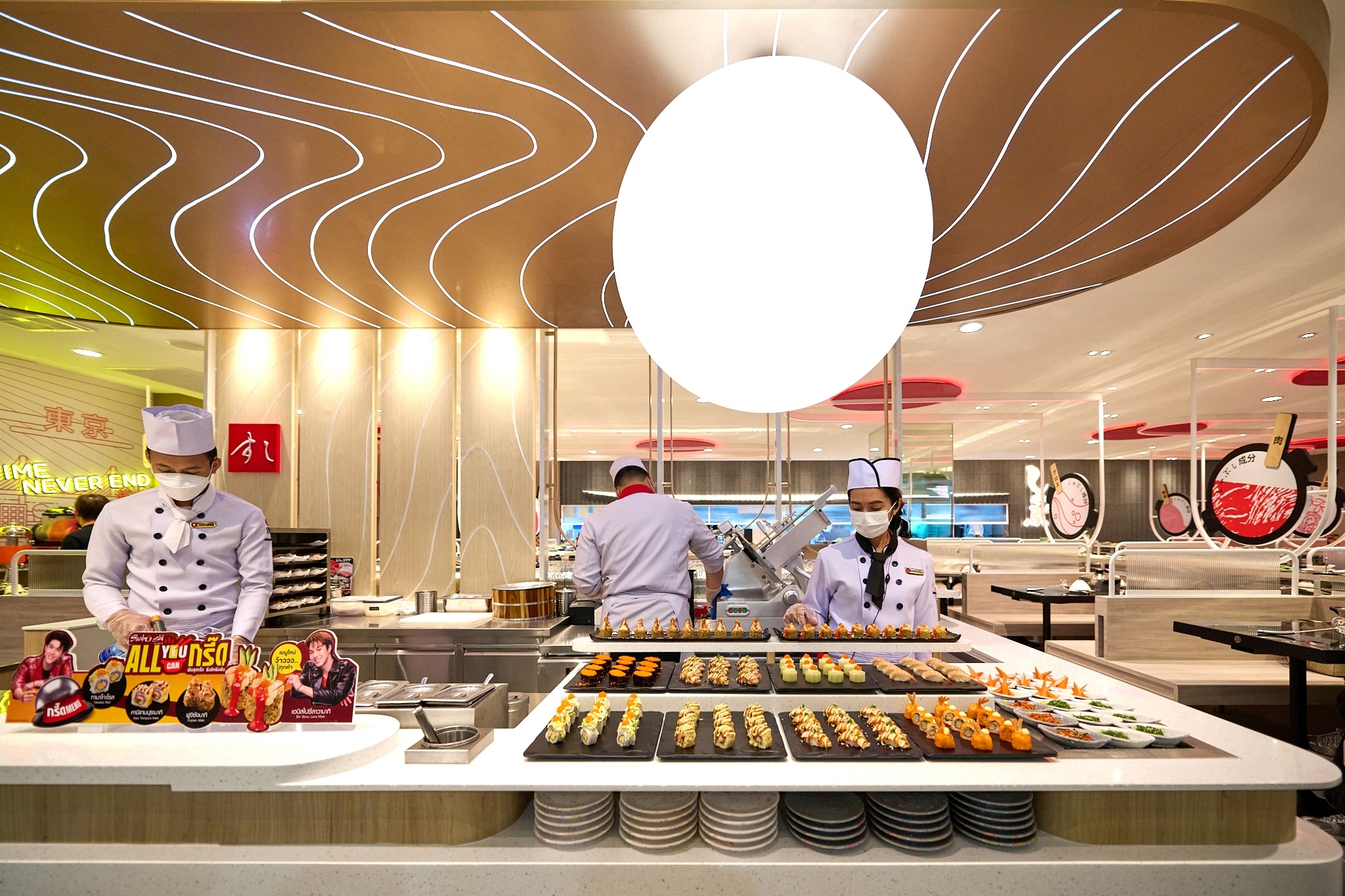 โดยหนึ่งในไฮไลต์ที่สร้างความแตกต่าง คือ การนำเสนอ “Sushi-Master Station” ซึ่งมาในรูปแบบครัวเปิด ให้ลูกค้าได้ใกล้ชิดกับทุกขั้นตอนการปรุงแต่งซูชิอย่างเต็มตา ตั้งแต่การตระเตรียมวัตถุดิบคุณภาพ ไปจนถึงขั้นตอนการปรุงแต่งอย่างประณีต...คำต่อคำ ซึ่งนอกจากจะเพิ่มความมั่นใจในความสดใหม่และคุณภาพแล้ว ยังช่วยเพิ่มมิติของประสบการณ์ (visual experience) ที่สามารถถ่ายรูป แชร์ และบอกต่อได้อย่างน่าประทับใจ ตอบรับกับพฤติกรรมผู้บริโภคในยุคโซเชียลที่นิยมสร้างคอนเทนต์ระหว่างการรับประทานอาหาร อีกทั้งยังสะท้อนจุดแข็งเฉพาะตัว ในฐานะร้านชาบู – ชาบู ที่มีซูชิคุณภาพเยี่ยม ด้วยการยกระดับประสบการณ์ซูชิให้หลากหลายและสร้างสรรค์ยิ่งขึ้น รวมแล้วกว่า 30 รายการ ที่สร้างสรรค์อย่างพิถีพิถัน เพื่อมอบความอร่อยในอีกระดับ ตอบโจทย์ทั้งคอซูชิจริงจัง และนักกินสายแชร์อย่างลงตัว
