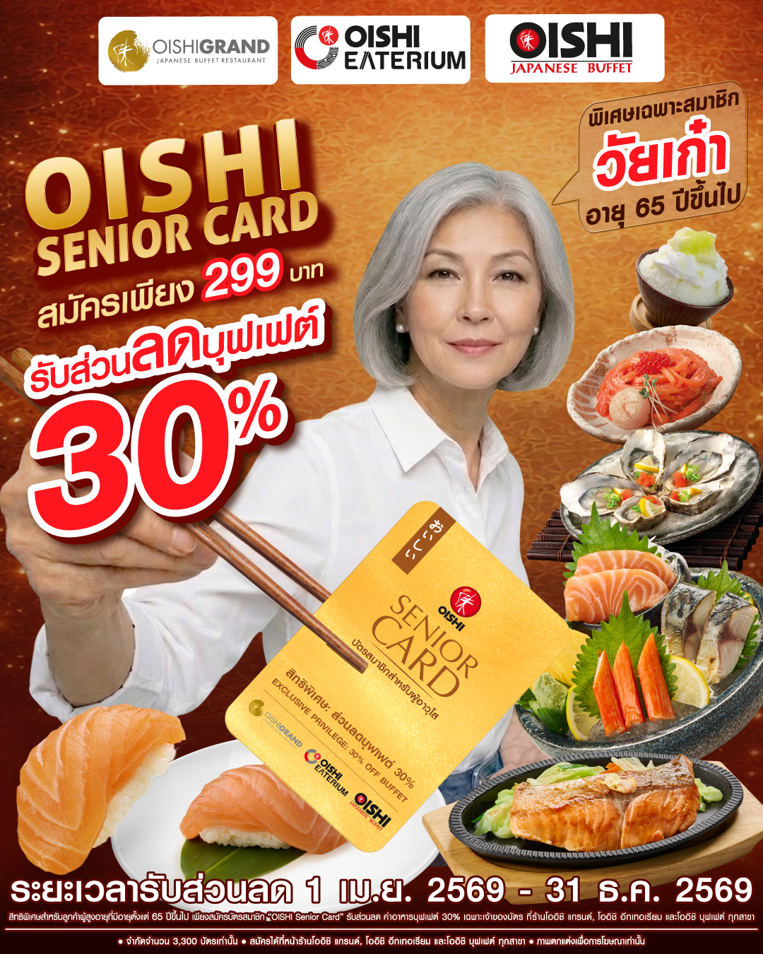 • สมาชิกต้องแสดงบัตร Oishi Senior Card พร้อมบัตรประชาชนเจ้าของบัตรให้พนักงานก่อนชำระค่าบริการ