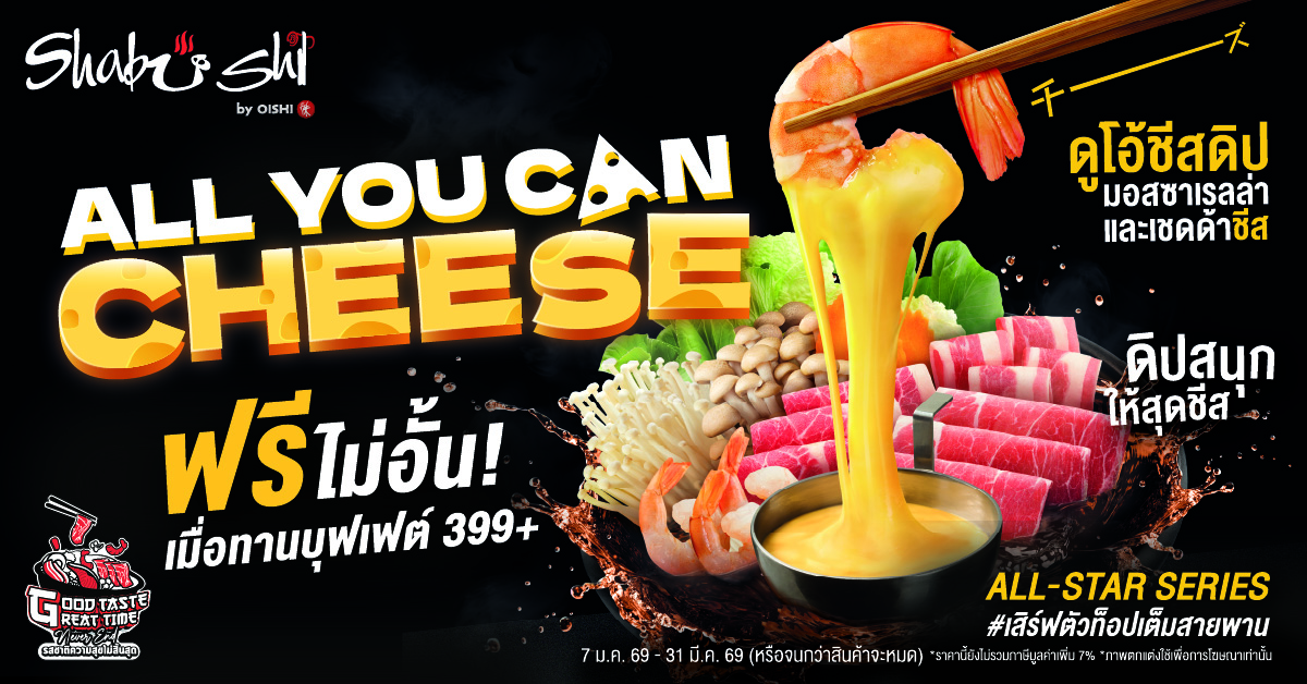 ครั้งแรกกับชาบู “ดูโอ้ชีสดิป” | คนรักชีส อร่อยจุใจกับเมนูตัวท็อปล่าสุด! จาก ALL-STAR SERIES ฟินจุใจกับ “มอสซาเรลล่า และเชดด้าชีส” พร้อมนานาเมนูชาบู ซูชิ และอาหารทานเล่นสไตล์ญี่ปุ่น ในเทศกาล “Shabushi All You Can Cheese” ที่ Shabushi ทุกสาขา