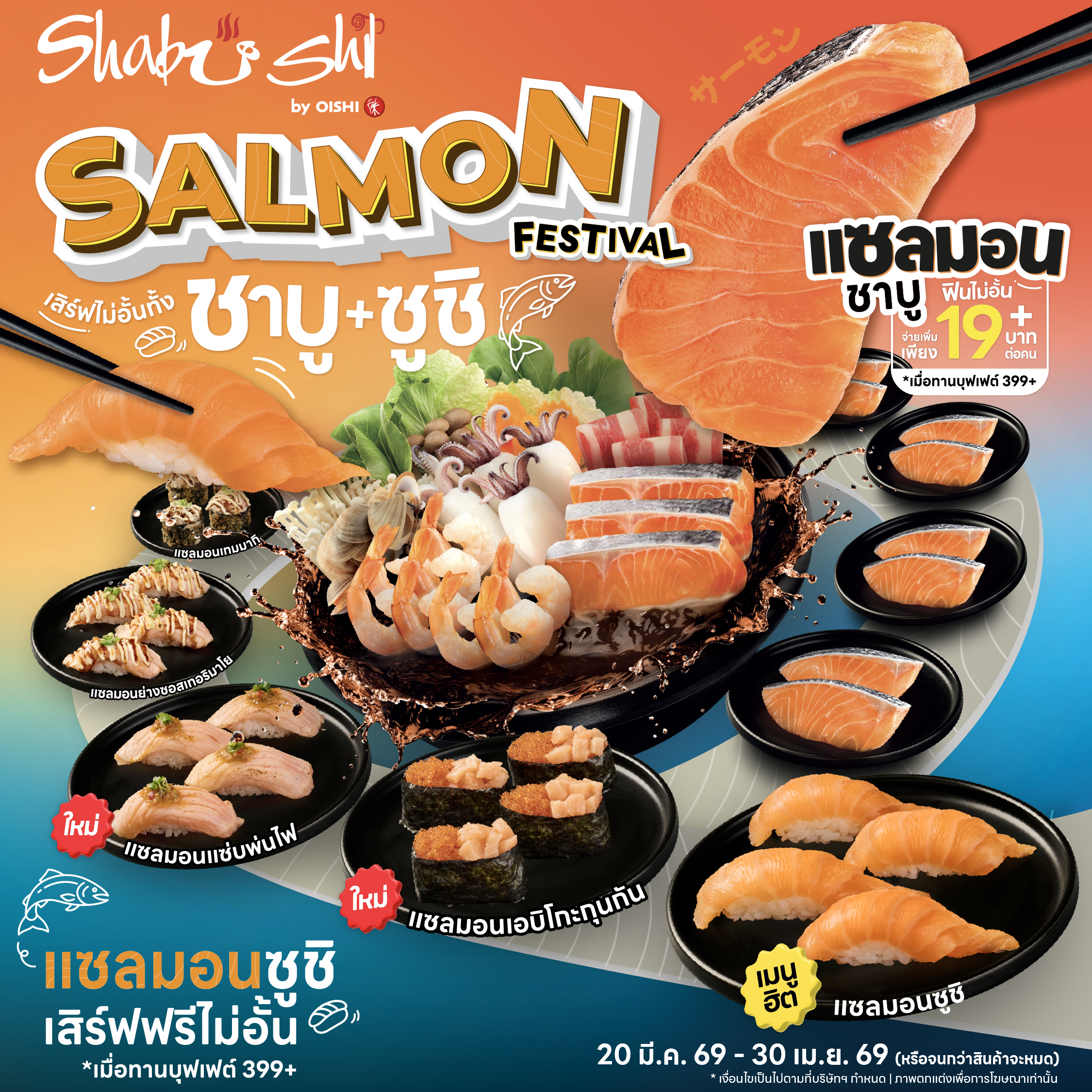 1. เสิร์ฟไม่อั้น ”แซลมอน” เมื่อใช้บริการบุฟเฟต์ที่ร้าน Shabushi ตลอดระยะเวลาแคมเปญ หรือจนกว่าสินค้าจะหมด ตามเงื่อนไขดังนี้ :